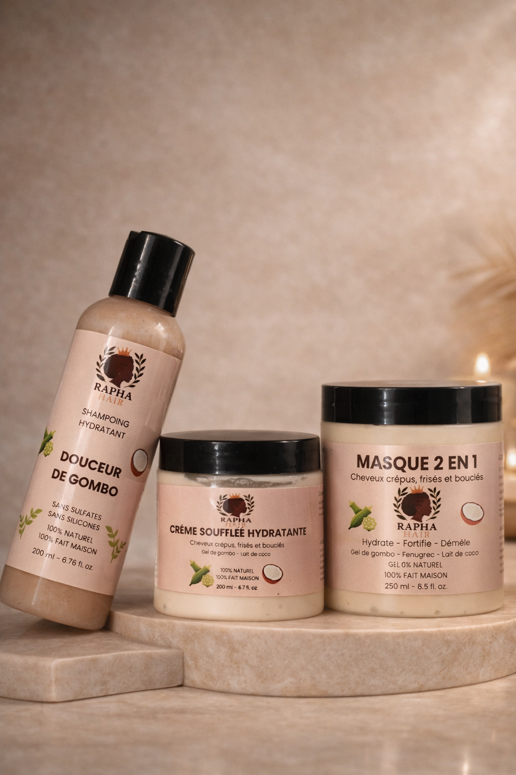 Le Shampoing Douceur de gombo nettoie sans dessécher, le Masque 2 en 1 – Soin profond revitalisant hydrate, nourrit et stimule la pousse, puis la Crème soufflée hydratante apporte souplesse, réduit la casse et limite les frisottis.